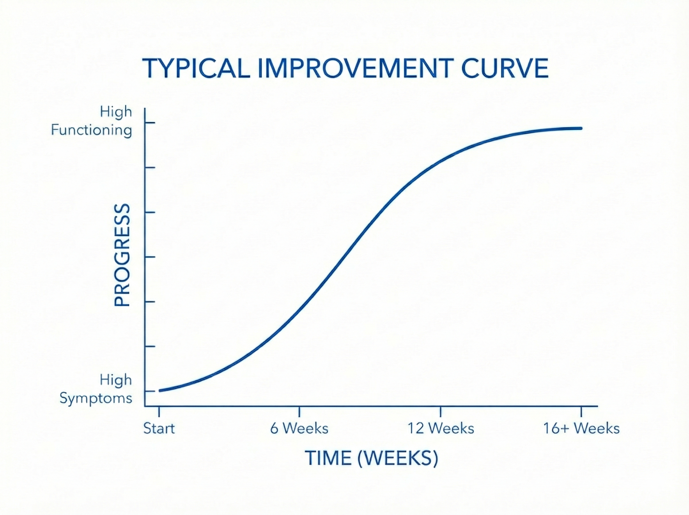 TYPICAL TIMELINE: Most families see meaningful improvement in 12-16 weekly sessions, though this varies based on the severity and duration of symptoms.